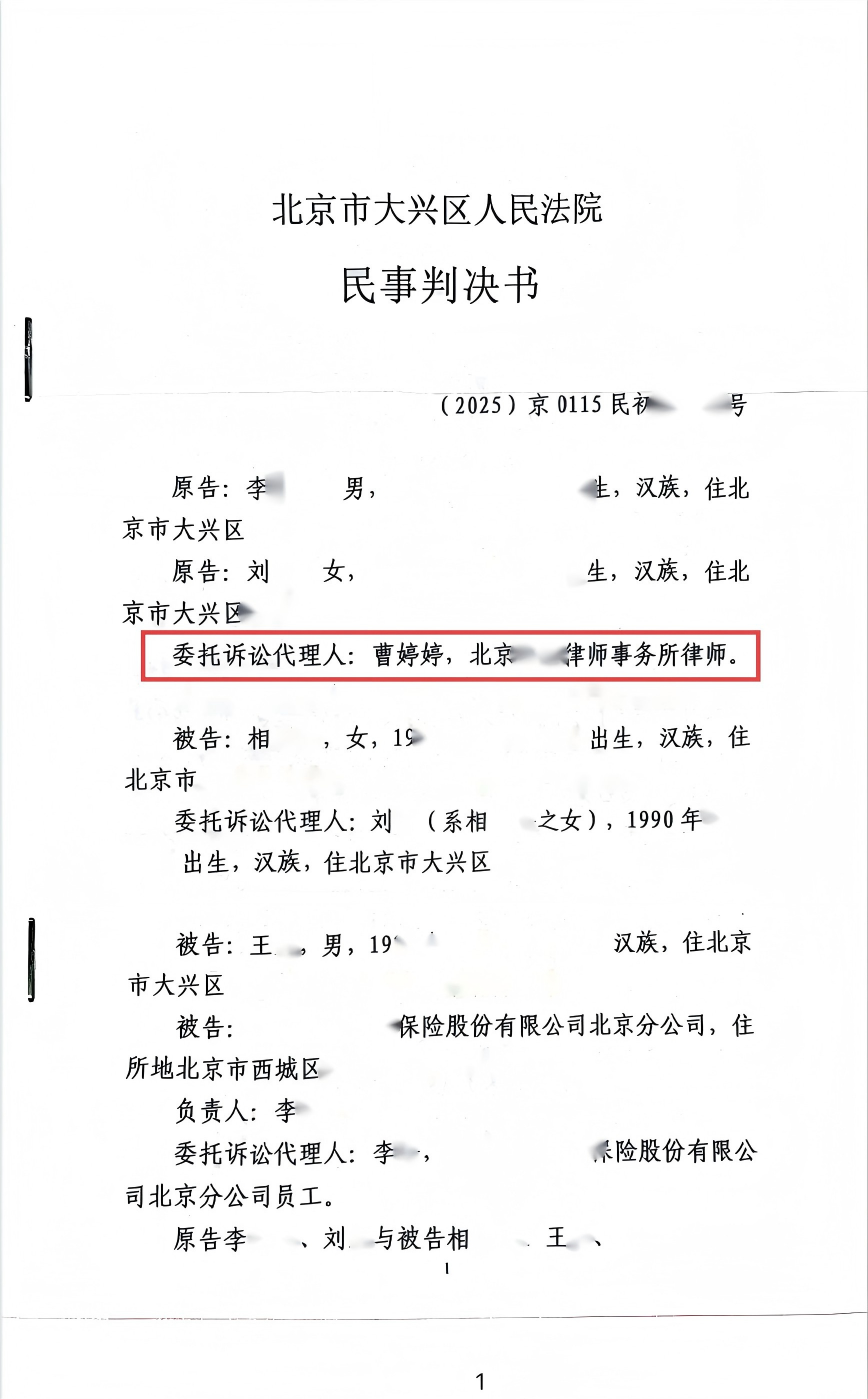 在机动车交通事故责任纠纷中,事故责任认定与民事赔偿比例常受多方因素影响,受害人自身过错、好意同乘、保险赔付顺序均是关键变量。李某、刘某(受害人罗某亲属)与相某、王某及某保险股份有限公司北京分公司(简称“某保险公司”)的纠纷案,便聚焦这些核心问题。曹婷婷律师作为原告代理人,为受害人亲属提供专业支持,北京市大兴区人民法院最终审理此案,明确了责任边界与赔偿规则。