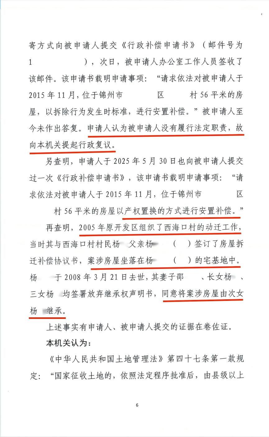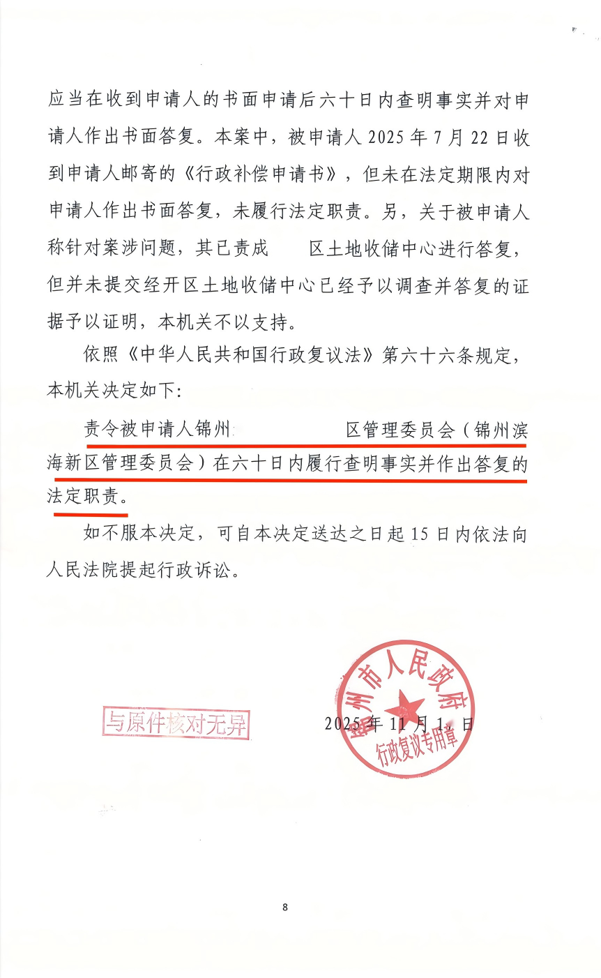 案件详情 从2005年某区启动某村动迁,到2025年锦州市人民政府责令征收部门履行补偿职责,杨某的房屋补偿维权之路横跨20年。这起由北京京来律师事务所许安港律师代理的行政复议案,以 “跨越二十年历史遗留争议获突破” 为核心亮点,不仅为当事人打开维权新局面,更成为行政机关解决历史征收补偿问题的典型参照。 案件的时间脉络清晰勾勒出维权的艰辛:2005年,某区组织某村动迁,杨某父亲杨某某的有照房屋虽获补偿,但案涉56平方米房屋因补偿标准争议未签订协议,被保留下来。2015年,该房屋被不明人员拆除,杨某多次向公安机关、村委会等反映,却始终未获实质性解决。直至2025年,杨某通过政府信息公开才确认房屋拆除与“某新村项目” 相关,随后两次提交《行政补偿申请书》,仍遭某区管委会(锦州某新区管委会)漠视,未收到任何书面答复。 20 年的时间跨度,让案件不仅涉及当前行政履职争议,更牵扯历史征收补偿的遗留问题 — 如何在时隔多年后厘清2005年征收时的未决争议,如何让 2025 年的行政机关对过往履职漏洞负责,成为此案的核心难点。许安港律师介入后,精准抓住 “征收主体法定职责” 这一关键:尽管争议始于2005年,但被申请人作为相当于县级人民政府的派出机关,对其组织实施的征收范围内的补偿申请,始终负有查明事实、作出答复的法定职责,不能因时间跨度而推诿。 锦州市人民政府在行政复议中查明:2025年7月22日被申请人签收《行政补偿申请书》后,未在60日法定期限内答复,且无证据证明已履行职责,其行为构成行政不作为。最终依据《土地管理法》《行政复议法》相关规定,责令被申请人在60日内履行查明事实并作出答复的法定职责 — 这一决定,意味着时隔20年,2005年征收时遗留的补偿争议终于被上级机关纳入法定处理程序,杨某的维权迎来实质性进展。 决定书 此案的亮点不仅在于“20年争议终获推动”,更在于它为历史征收补偿遗留问题的解决提供了路径:即便征收行为发生多年,只要行政机关未依法完成补偿义务,公民仍可通过合法途径主张权利;上级行政机关也需通过行政复议等监督手段,督促下级机关正视历史遗留问题,不能以 “时间久远” 为由逃避法定职责。许安港律师凭借对历史案件法律关系的精准梳理,成功推动上级机关支持当事人诉求,让 20 年的维权等待有了明确的履职承诺,彰显了专业法律服务在破解历史行政争议中的关键价值。 经 典 案 例 往 期 文 章 1.经典案例·刑事 | 马云、许安港律师共同代理覃某良故意伤害案:检察院以证据不足撤诉,法院依法裁定准许 2.最高院再审推荐经典案例:经销商以二手车冒充新车销售,许安港、续佳律师助力消费者获三倍赔偿 3.经典案例|马云、王非律师-主观故意不是“推定项”:掩饰、隐瞒犯罪所得罪 不起诉背后的司法边界 4.经典案例|临危受命显实力!马云、许安港律师代理覃某良案:先促证据不足撤诉,再获国家赔偿 5.经典案例|许安港律师代理姜某延期安置房维权:房地产公司被判付高额违约金+住房补贴至交房