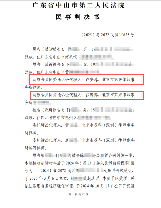 在广东省中山市第二人民法院房屋租赁合一案中,梁某、何某与陈某就中山市黄圃镇新发南路某物业的租赁合同产生纠纷,北京市京来律师事务所吕海博律师协同许安港律师接受梁举帆、何结芳委托,全程提供专业代理服务。