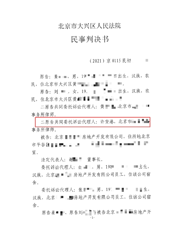 在北京市大兴区人民法院(2021)京 0115 民初某号拆迁补偿合同纠纷中,许安港律师接受姜某、刘某委托,全程提供专业法律服务,助力二人成功维护拆迁补偿权益。