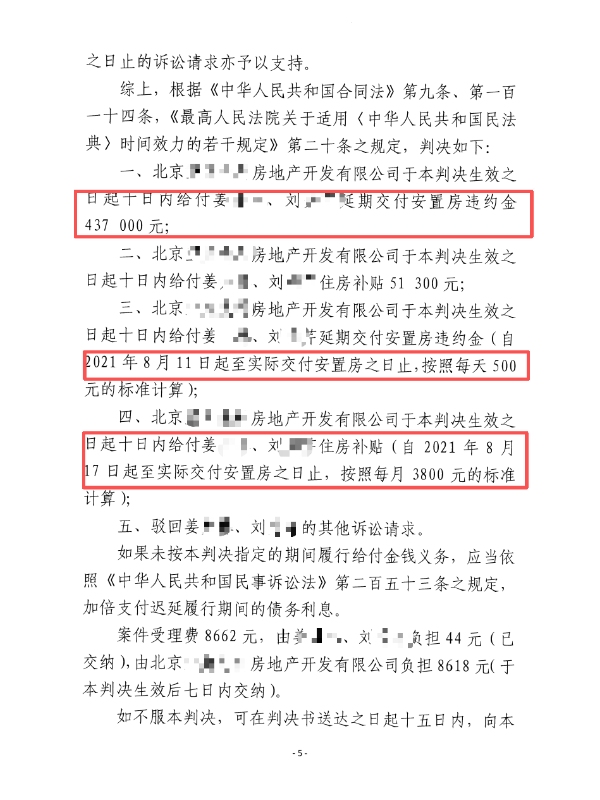 该案源于 2007 年 8 月,姜某、刘某与北京某房地产开发有限公司(下称 “某公司”)签订《拆迁补偿安置协议》,约定某公司提供安置房、支付补偿款及过渡期间住房补贴,逾期交房需按 500 元 / 天付违约金。协议签订后,姜某、刘某依约交付被拆迁房屋,某公司却长期违约:未交付安置房,且自 2019 年 3 月起停付违约金、2020 年 6 月后停付住房补贴,协商无果后引发诉讼。