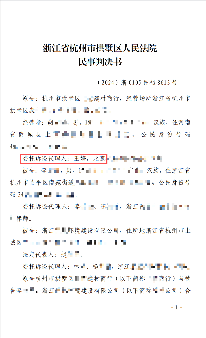 在浙江省杭州市拱墅区人民法院审理的(2024)浙0105民初86*号杭州市拱墅区某建材商行诉李某、浙江某环境建设有限公司合同纠纷一案中,王婷律师担任原告某建材商行的委托诉讼代理人。案件中,两被告多年来刻意混淆证据—李某一方故意将不同工程的结算费用重复标注、隐瞒部分付款的真实指向,某环境建设公司则用零散无关联的转账记录掩盖欠款事实,让证据链看似混乱无序;面对此困境,王婷律师抽丝剥茧,厘清法律关系与账目逻辑,最终推动法院认定浙江某环境建设有限公司为付款主体,助力某建材商行成功追回1478304.59元欠款及逾期利息。