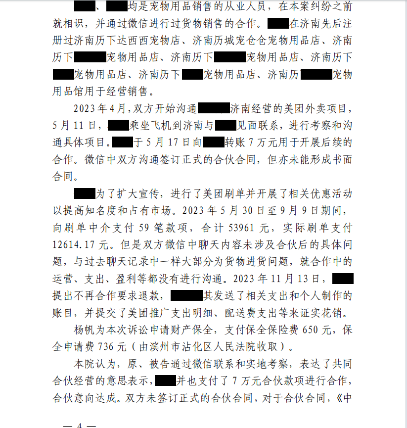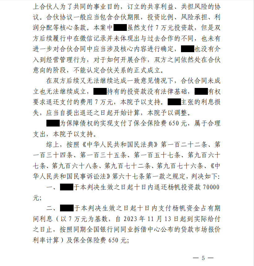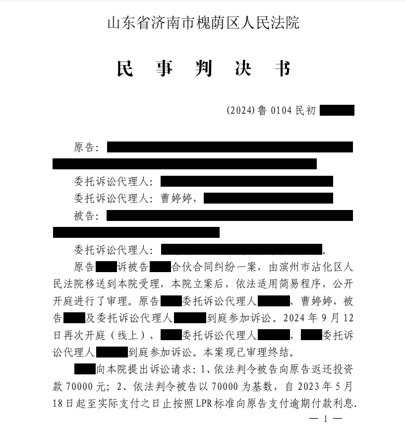 曹婷婷律师代理原告胜诉:合伙关系未成立,法院判决被告全额返还7万元投资款并支付利息。