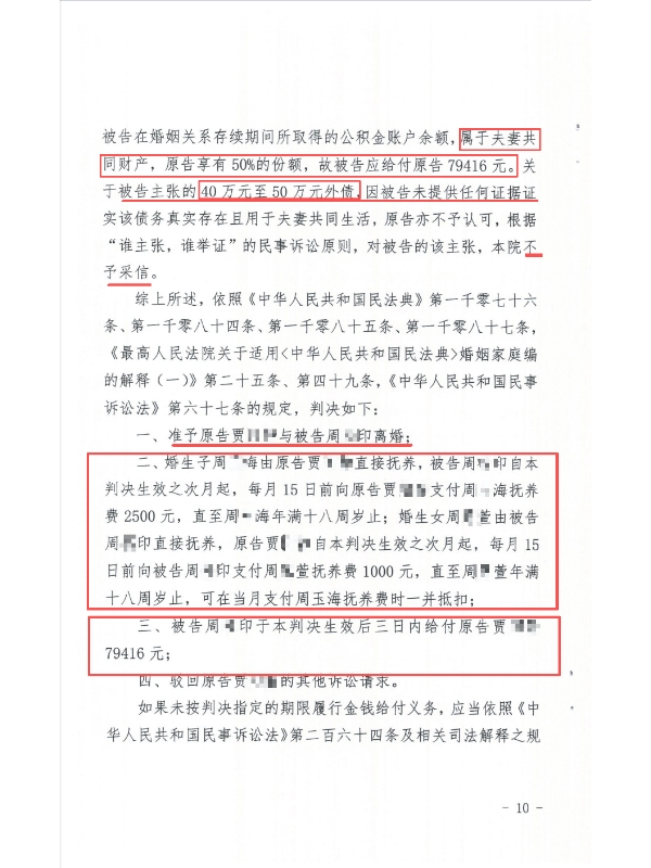 庭审中,针对抚养权争议,律师团队紧扣 “子女利益最大化” 原则:长女已满 8 岁且明确愿随父亲生活,便转而争取 “合理抚养费”(最终法院判贾女士每月付 1000 元,远低于男方要求的 5000 元);幼子尚处婴幼儿阶段且长期随贾女士生活,团队强调 “婴幼儿需稳定抚养环境” 及男方 “加班酗酒、无精力照料” 的劣势,最终法院判幼子由贾女士直接抚养,男方每月支付 2500 元抚养费。财产分割方面,律师援引《民法典》相关规定,明确男方公积金属共同财产,法院支持贾女士分得 79416 元;针对男方主张的外债,因无证据佐证,法院未予采信。