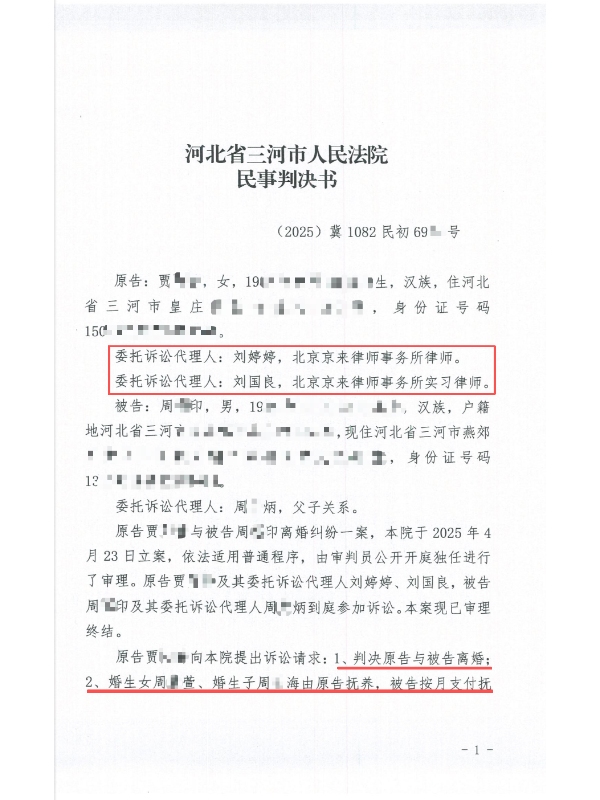 在河北省三河市人民法院审理的(2025)冀 1082 民初 69*号贾女士诉周某印离婚纠纷一案中,北京京来律师事务所刘婷婷律师(主办)与刘国良实习律师(协办)共同担任原告贾女士的委托诉讼代理人。面对贾女士分居后带幼子回娘家、被阻探视长女、抚养权与财产分割争议僵持的困境,两人通过清晰梳理诉求、精准组织证据,最终助力贾女士实现 “顺利离婚 + 幼子抚养权 + 公积金分割款” 的核心诉求,法院依法作出支持判决。