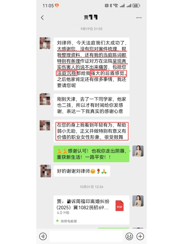 刘婷婷、刘国良律师介入后,首先帮贾女士将 “想离婚、要孩子、要分财产” 的模糊诉求,细化为符合法律规定的具体主张:明确幼子抚养权优先、长女抚养权尊重意愿(若无法争取则保障探视权)、男方婚后公积金按共同财产均分,并驳斥无证据外债。随后,团队协助贾女士补全关键证据:2022 年男方家暴后的报警记录与住院诊断、2023-2024 年长女学校老师的沟通记录(证明贾女士参与教育)、其父母退休金流水(每月 4000-6000 元,佐证协助抚养能力),以及男方公积金缴存明细(证实 158832 元均为婚后所得)。