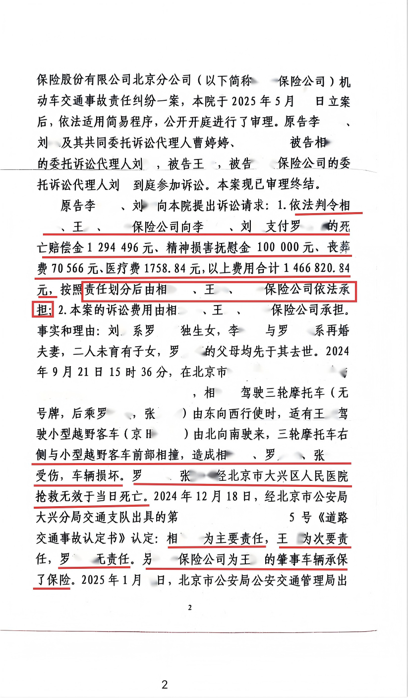 2024 年 9 月 21 日,相某无证驾驶无号牌三轮摩托车,搭载罗某、张某在北京市大兴区安定镇某路口行驶时,与王某驾驶的小型越野客车相撞,致罗某颅脑损伤当日死亡,且死亡与事故构成直接因果关系。交警部门认定相某主责、王某次责、罗某无责,复核后维持该结论;王某车辆在某保险公司投保交强险及 300 万元商业三者险,事故在保险期内。李某、刘某遂诉请三被告赔偿死亡赔偿金、丧葬费等共计 1466820.84 元。