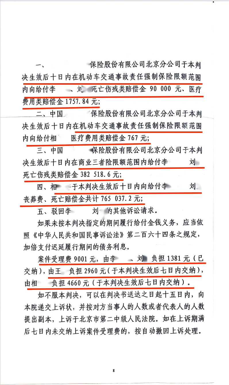 最终法院判决:某保险公司在交强险内给付李某、刘某 91757.84 元(死亡伤残 9 万元 + 医疗费 1757.84 元),给付相某垫付医疗费 767 元;在商业三者险内给付原告 382518.6 元;相某赔偿原告 765037.2 元。